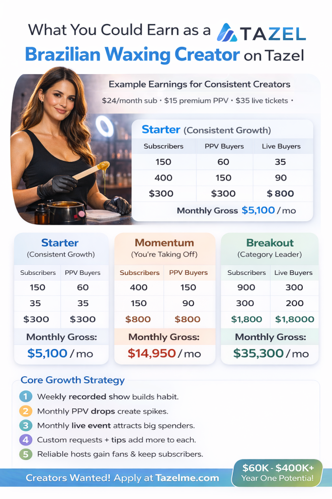 Brazilian waxing content sits within a proven intersection of beauty, transformation, and adult-adjacent curiosity—an intersection that already attracts millions of views across social platforms, tube sites, and creator marketplaces, despite being fragmented and poorly monetized. Grooming, hair removal, and body-confidence content consistently perform well in both mainstream and adult spaces, yet no dominant, professional destination exists for Brazilian waxing as a recurring show or live format. Even capturing a small fraction of viewers who already consume makeover, spa, cosmetic, and fetish-adjacent content represents a meaningful opportunity. With subscription-based access, premium PPV events, and live shows, a dedicated Brazilian Waxing Channel on Tazel is positioned to serve a market that is clearly validated by demand but largely untouched by creator-first monetization—making it a rare case of low saturation with high spending intent.